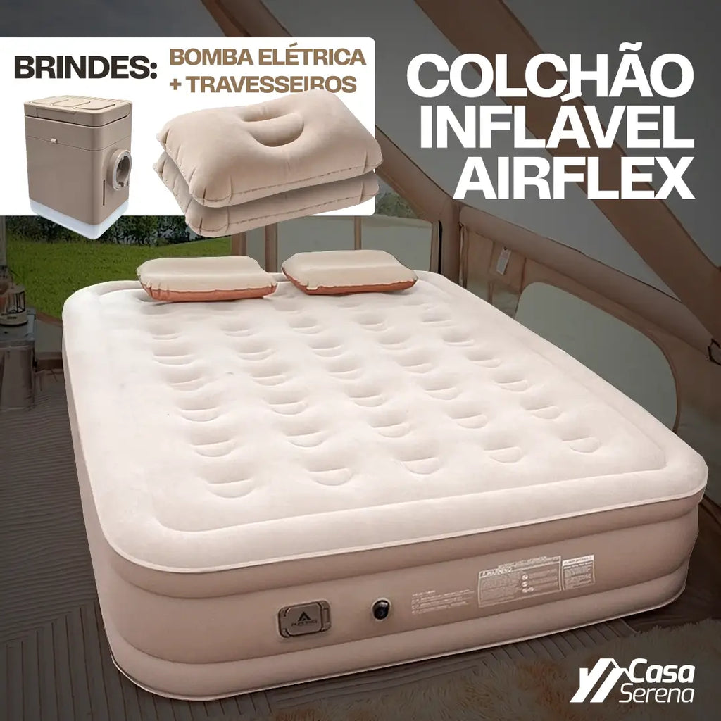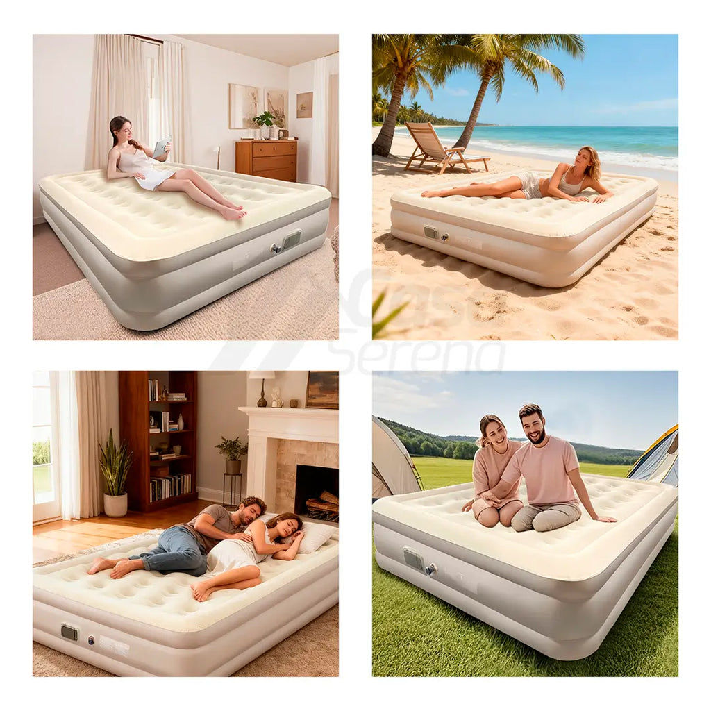O Colchão Inflável Airflex tem câmaras internas inteligentes que distribuem o peso de forma uniforme — sem afundar no meio e sem “efeito rede”.